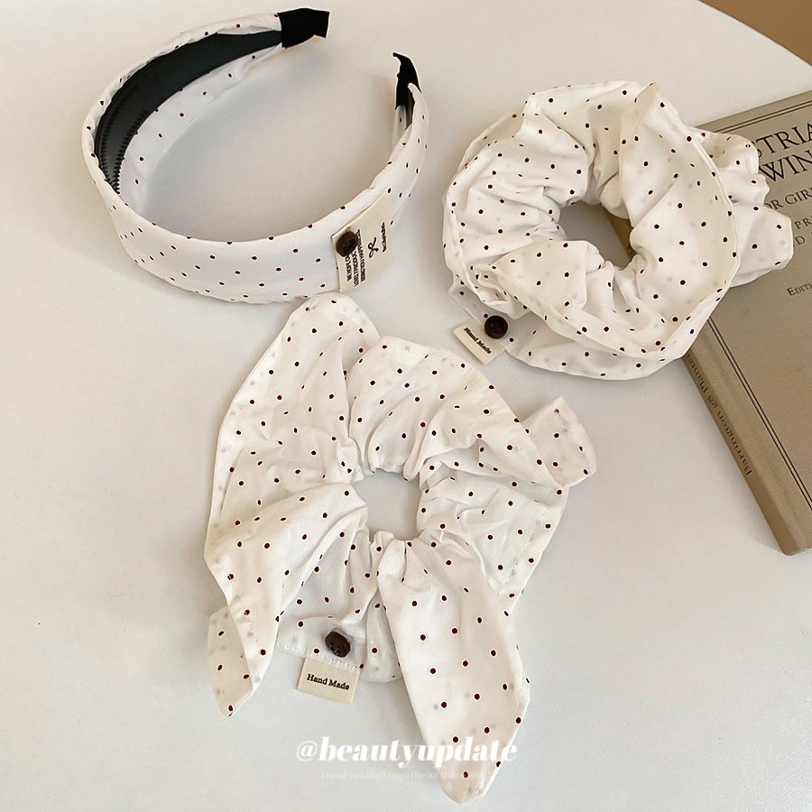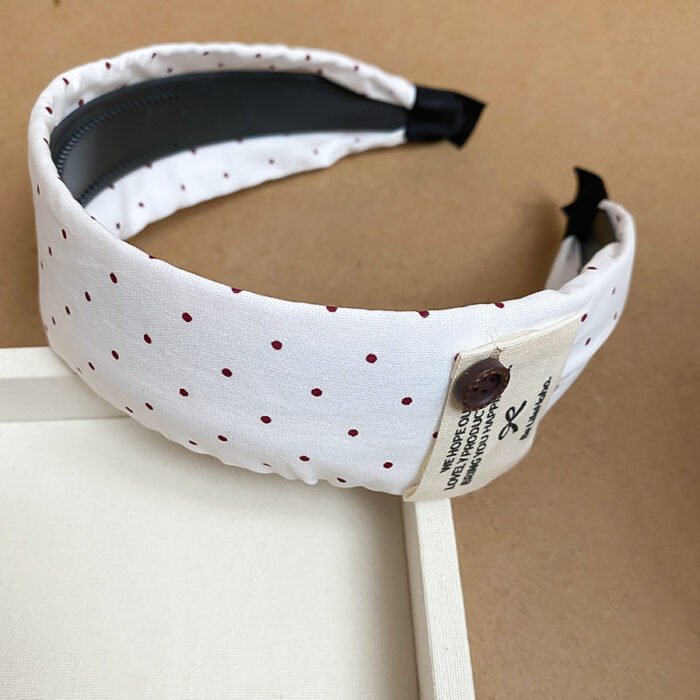 This fabric white polka dot wide-brim hair tie combines classic pattern with versatile design. Perfect for women who want a stylish yet practical accessory to create fashionable low ponytails or half-tied hairstyles with a high crown look.