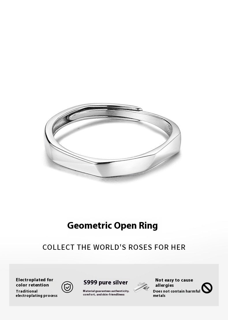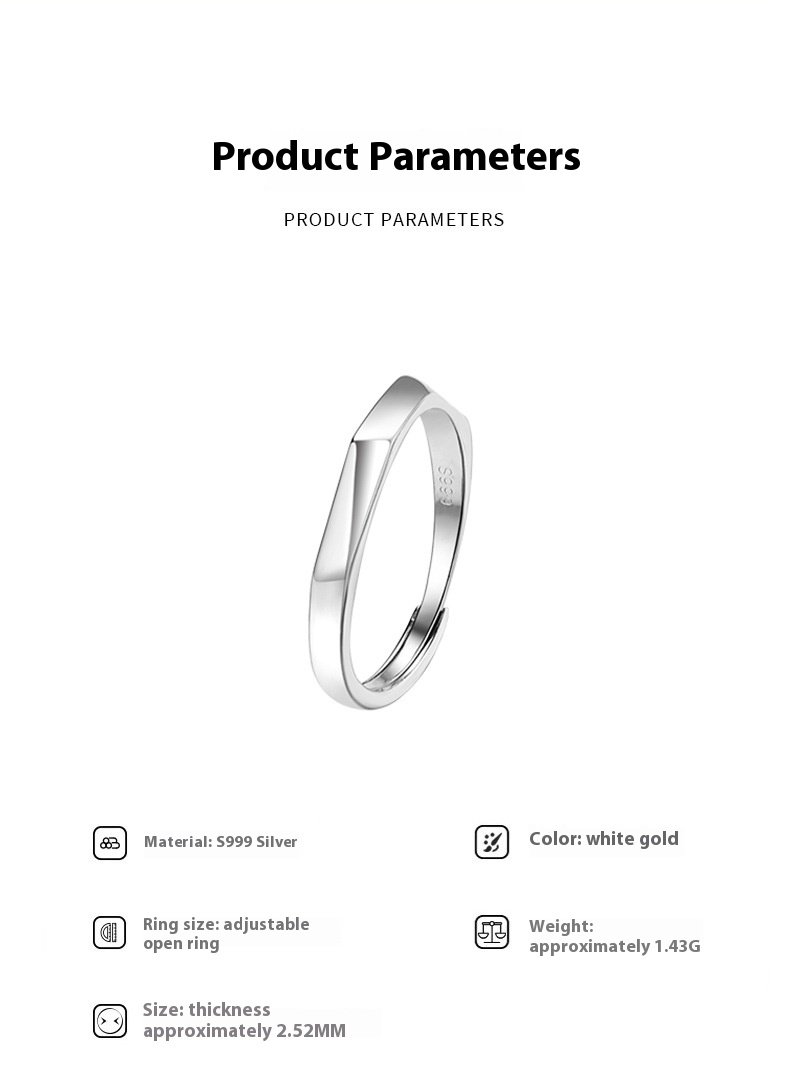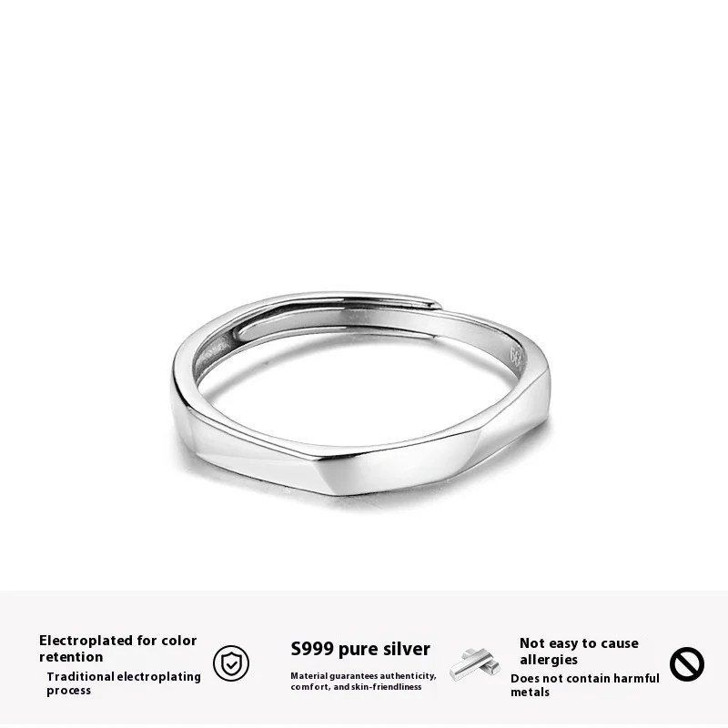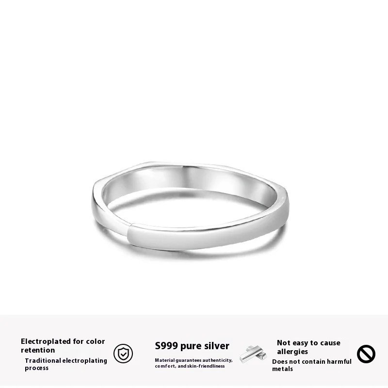 This Po 999 sterling silver ring features a sleek glossy finish and minimalist plain band design. Adjustable and stylish, it’s perfect for a cold, high-sense aesthetic—ideal for index finger wear and popular among women who love niche, modern jewelry.