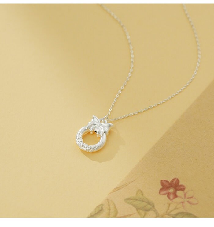 Po S999 Sterling Silver Bow Ring Necklace – Sweet Elegant Niche Clavicle Chain for Women