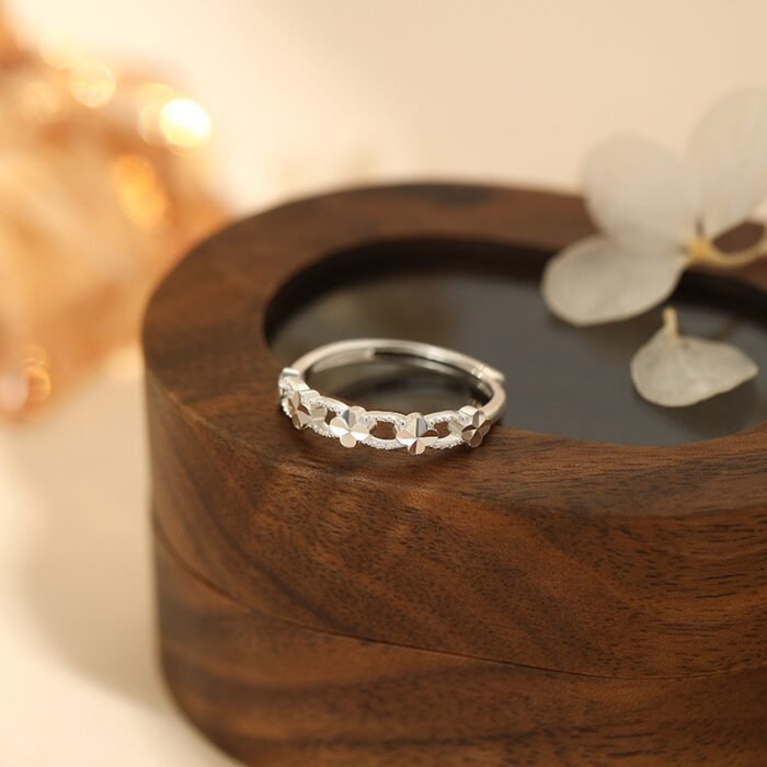 This S999 pure silver four-leaf clover ring blends luck and style with a lightweight, forest-inspired design. Perfect for everyday wear and trendy, meaningful accessories.