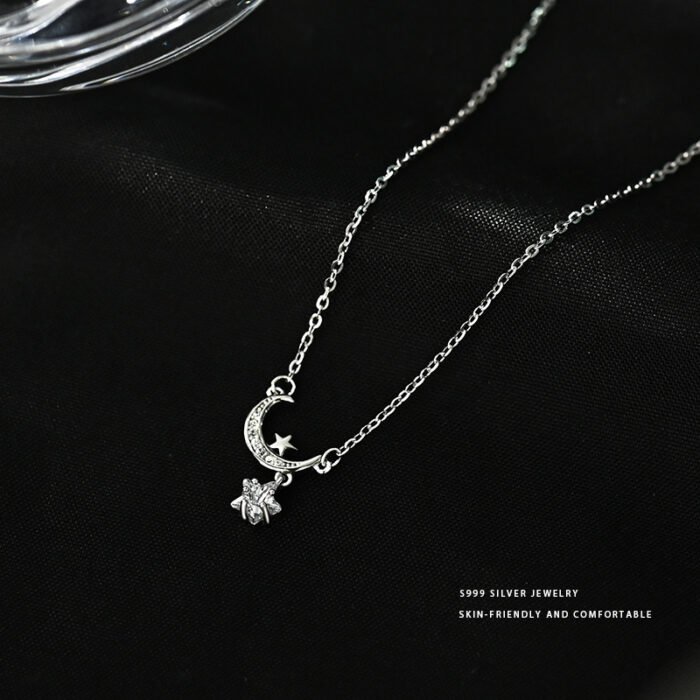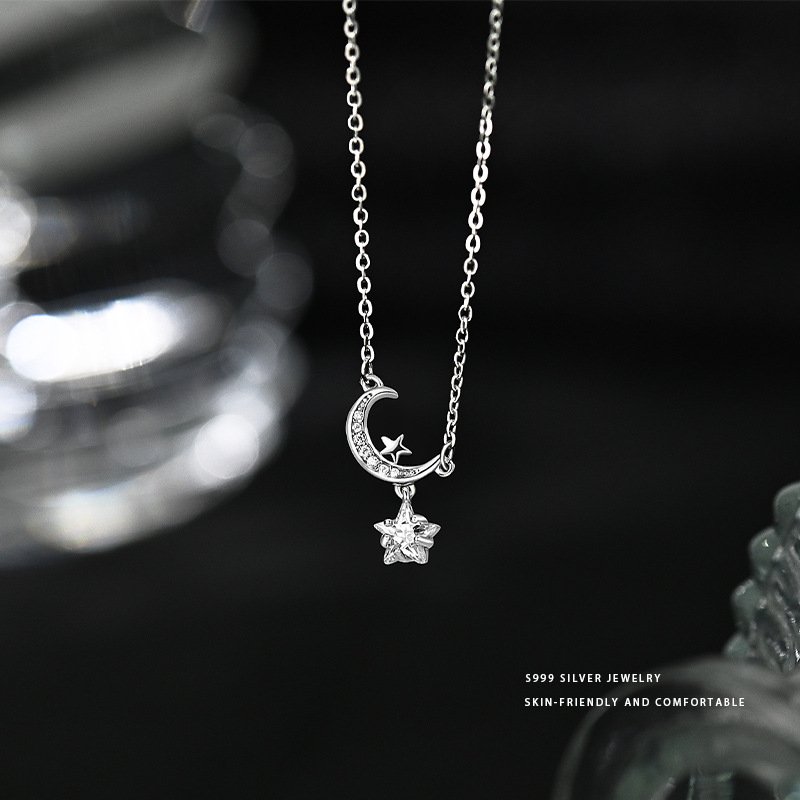 S999 Sterling Silver Star & Moon Necklace – Light Luxury Shiny Niche Clavicle Chain for Women